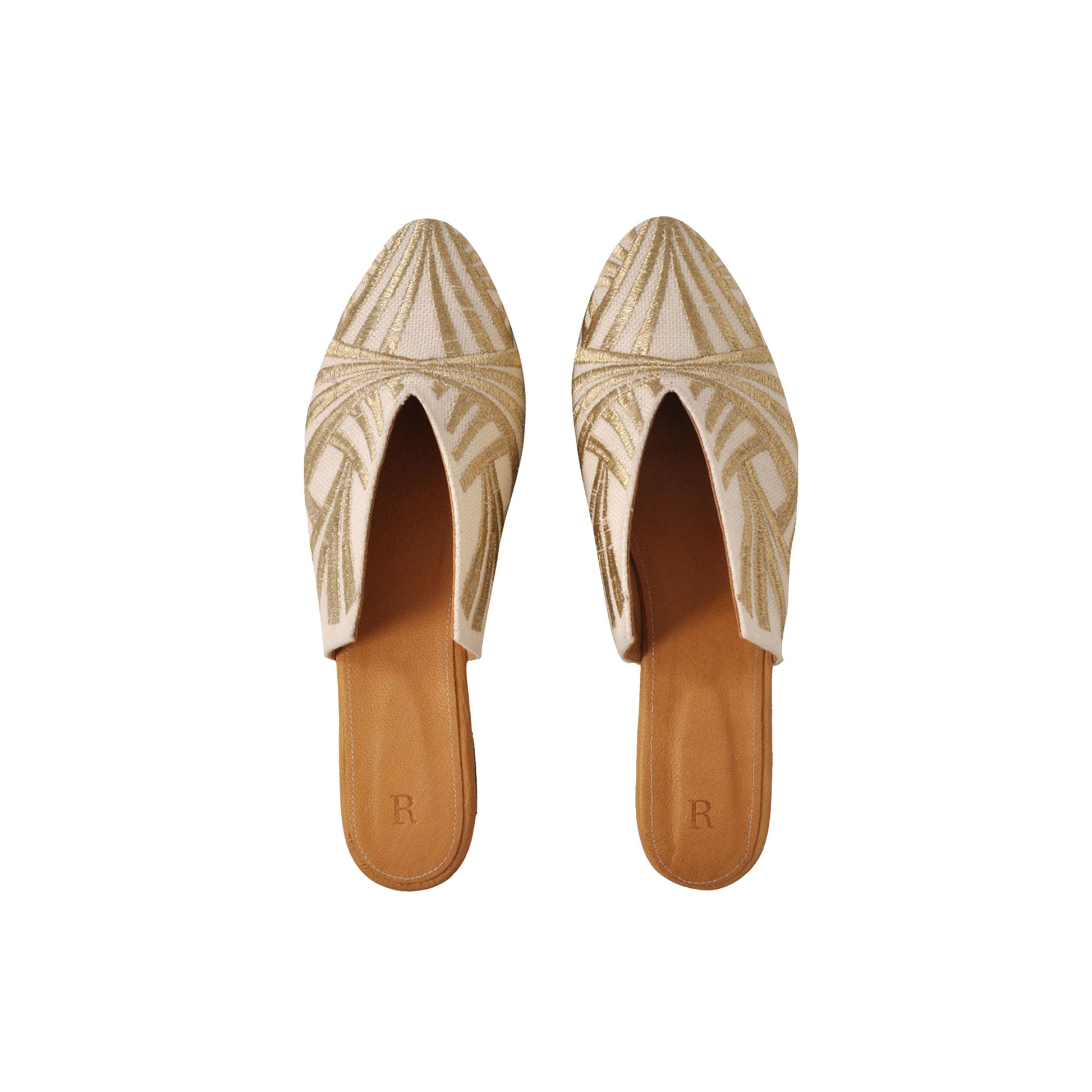Introducing the ultimate combination of comfort and style: RAMLA's Sahara Mule. Handcrafted with care by Egyptian artisans, these mules feature a natural brown leather sole inside out and linen gold embroidery that exudes elegance and sophistication. Perfect for everyday wear, this classic v cut style is designed to add a touch of luxury to any outfit. These shoes are sure to become a staple in your wardrobe all year long. Elevate your footwear game with the RAMLA Sahara Mule Shoes