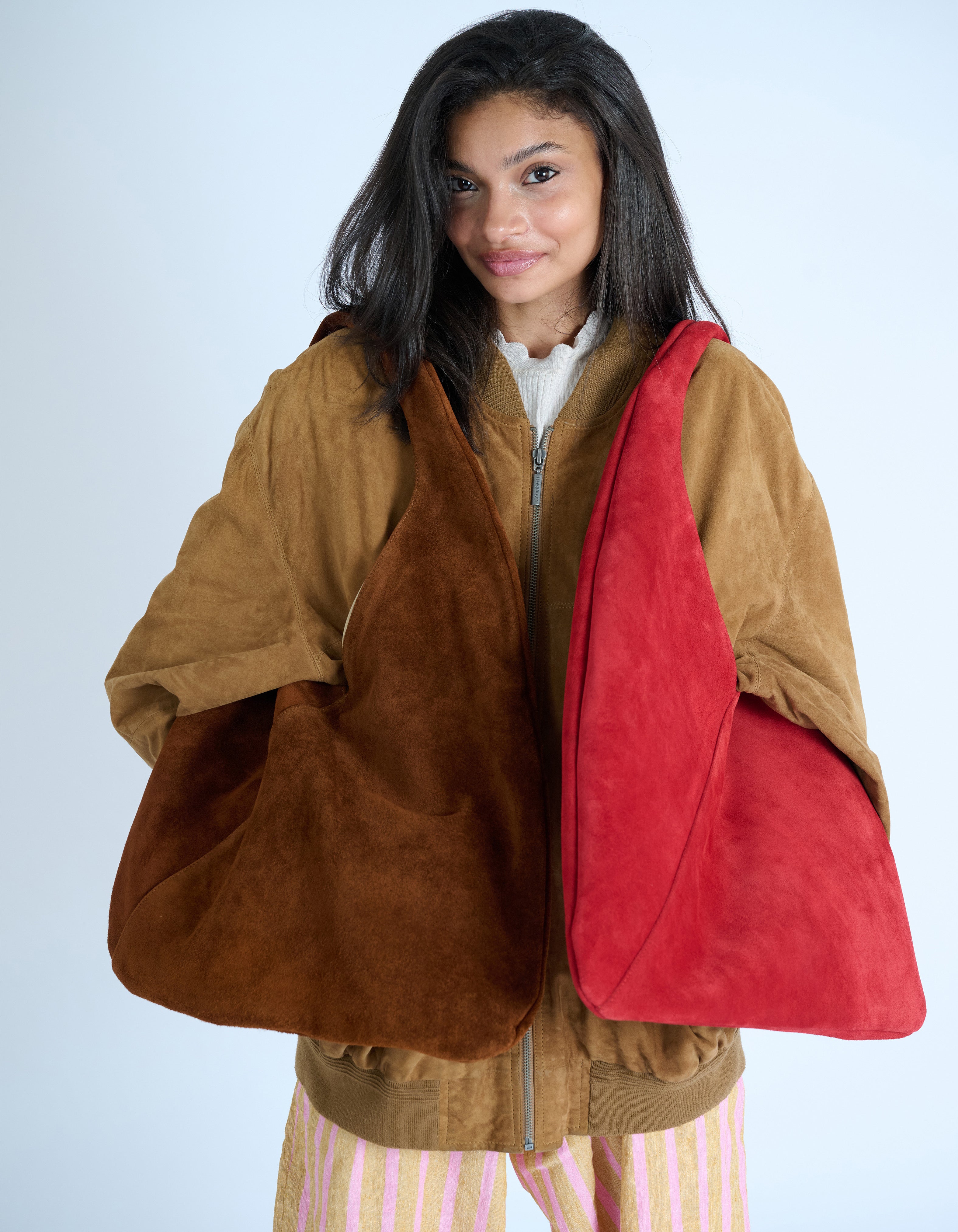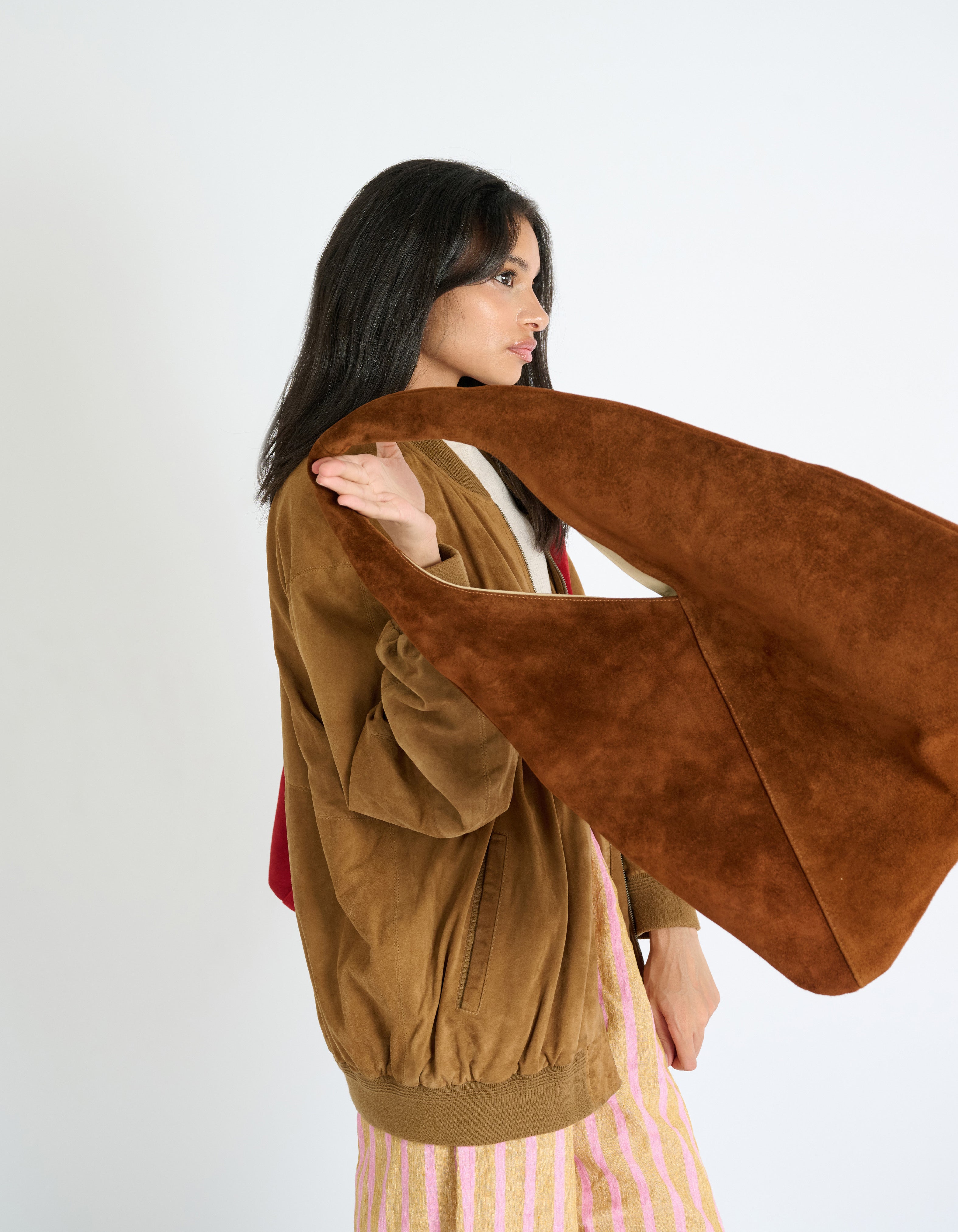 Crafted in supple chocolate suede leather, it folds softly in your hand yet holds its shape with quiet strength. Its deep, earthy tone mirrors the warmth of Egyptian heritage — grounded, versatile, and endlessly wearable. Whether carried to work, to a café, or through city streets, it moves with you, adapting effortlessly to your pace.