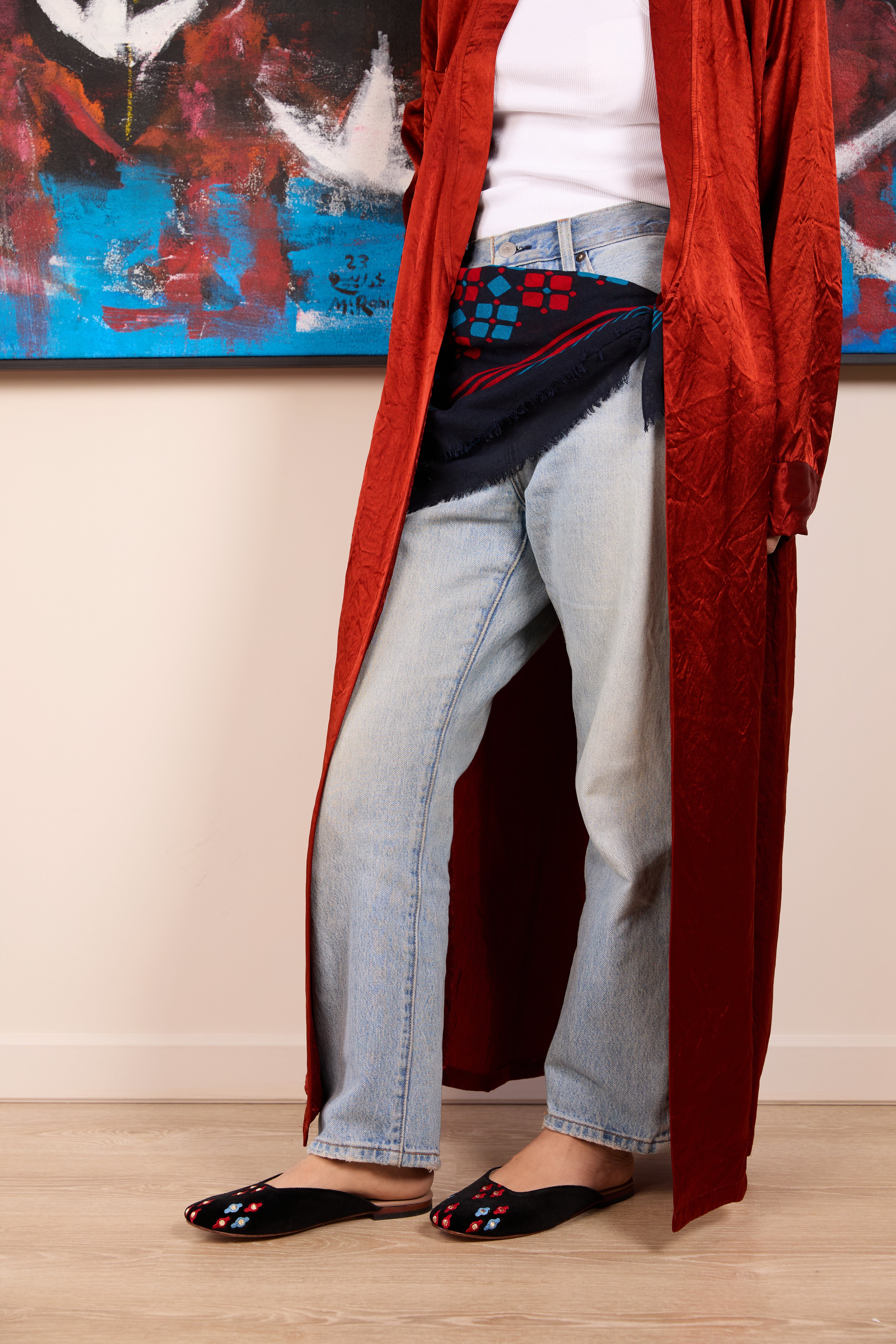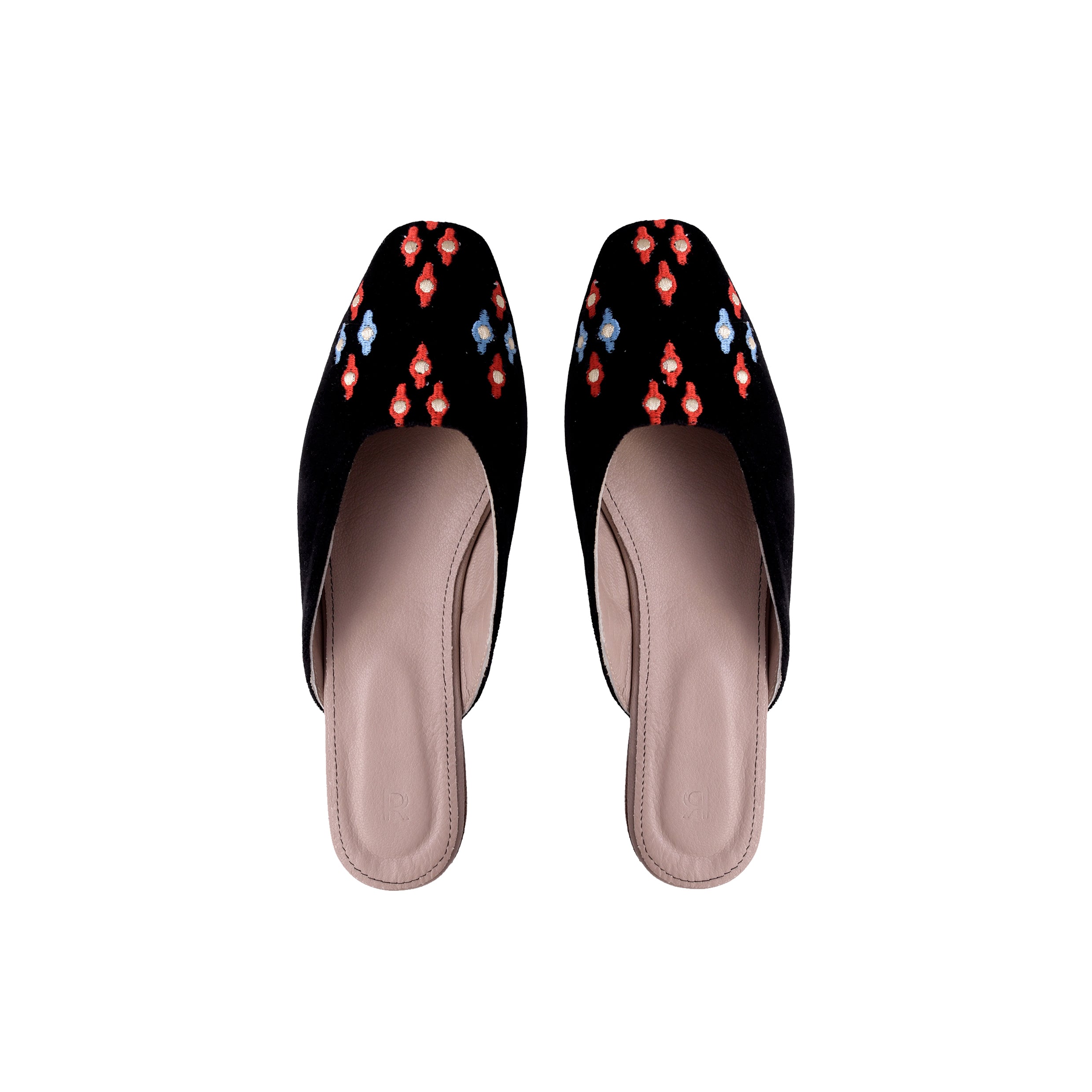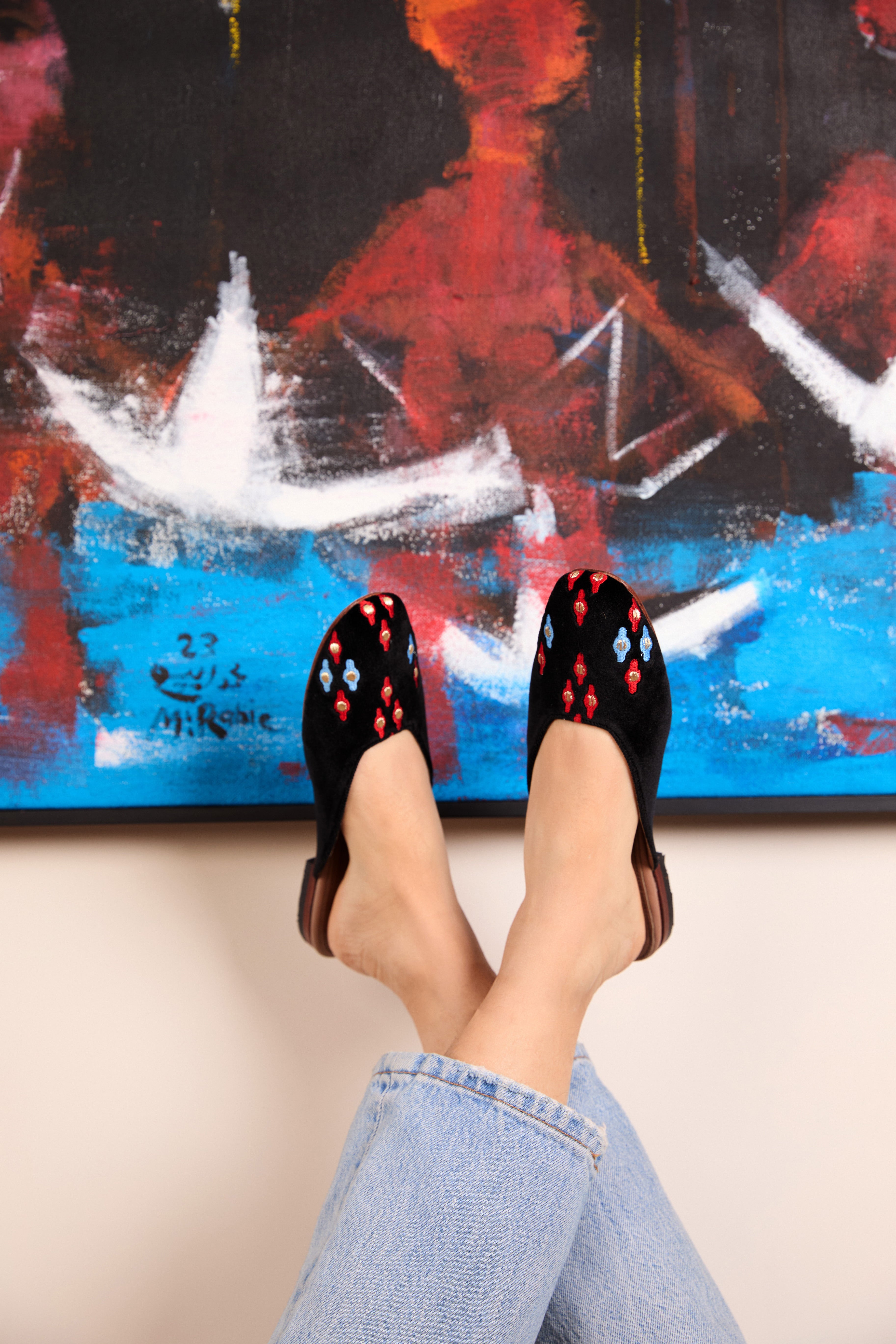 Crafted from the finest silk-cotton black velvet, Heritage Era delivers an irresistibly soft touch, wrapping your feet in refined elegance. Its delicate, vintage-inspired embroidery celebrates the nostalgic beauty of traditional motifs—reimagined for the modern, sophisticated RAMLA woman.