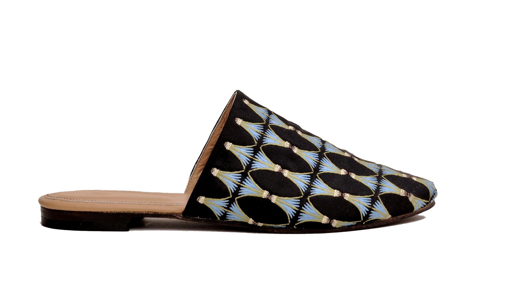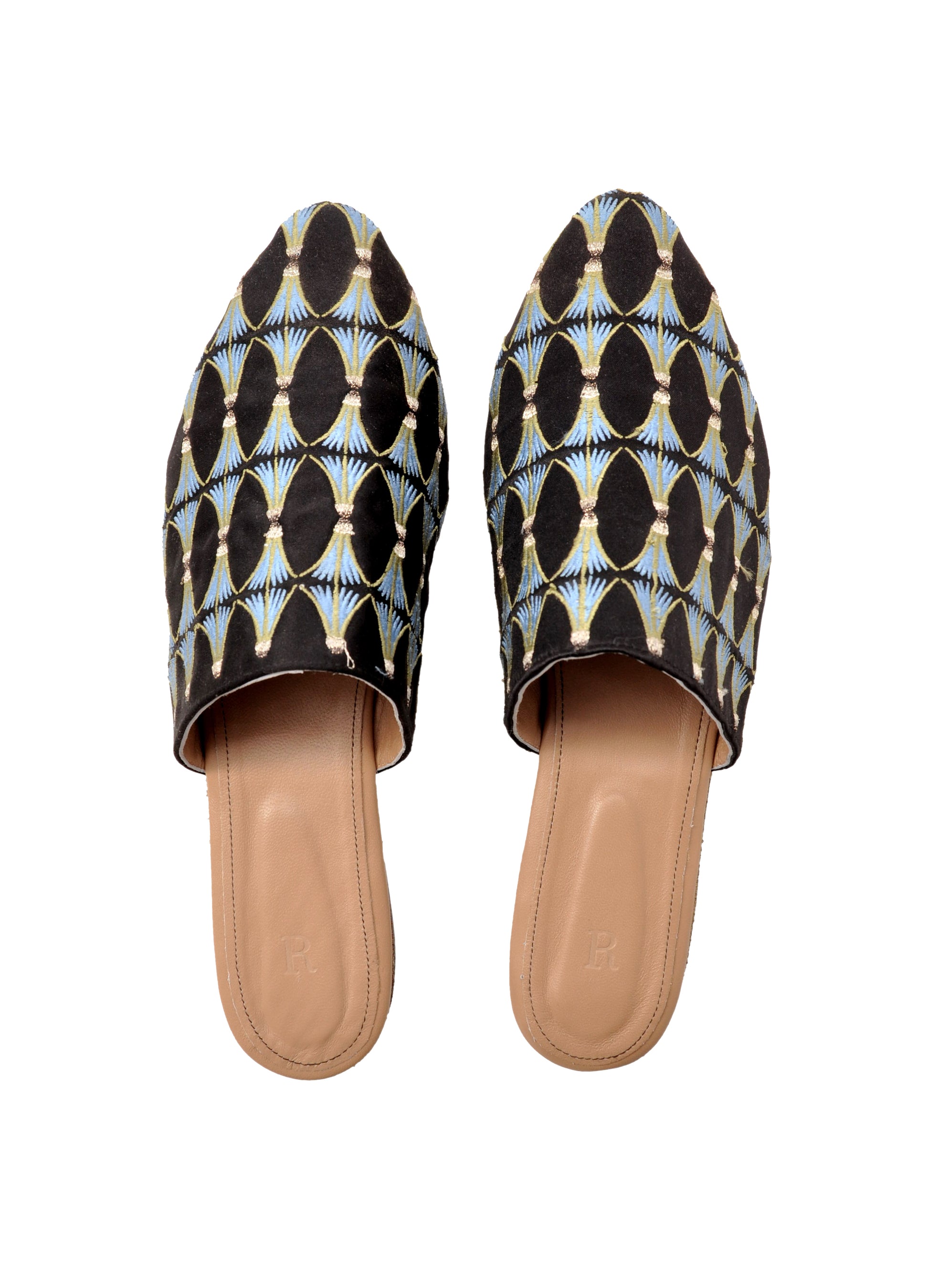 Step into the world of elegance and luxury with RAMLA's limited edition collection. Inspired by Egypts pharaonic heritage. This mule is a beautiful addition to your wardrobe. Handcrafted with care and designed with comfort in mind, the natural brown leather sole and v cut classic style covered with linen gold and different shades of blue embroidered fabric make these shoes perfect for everyday wear. The Flower Field Mule will add a touch of sophistication to your look.