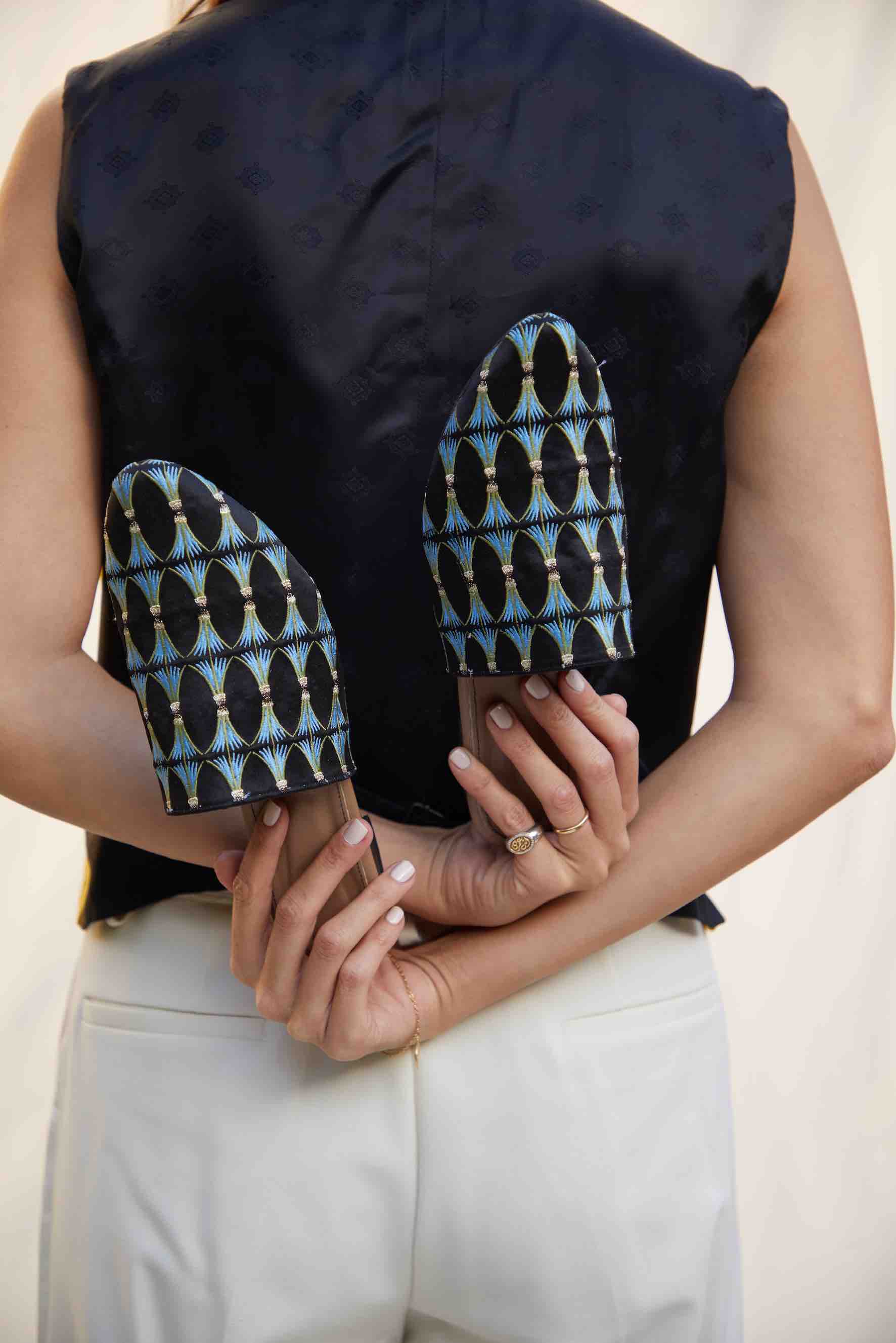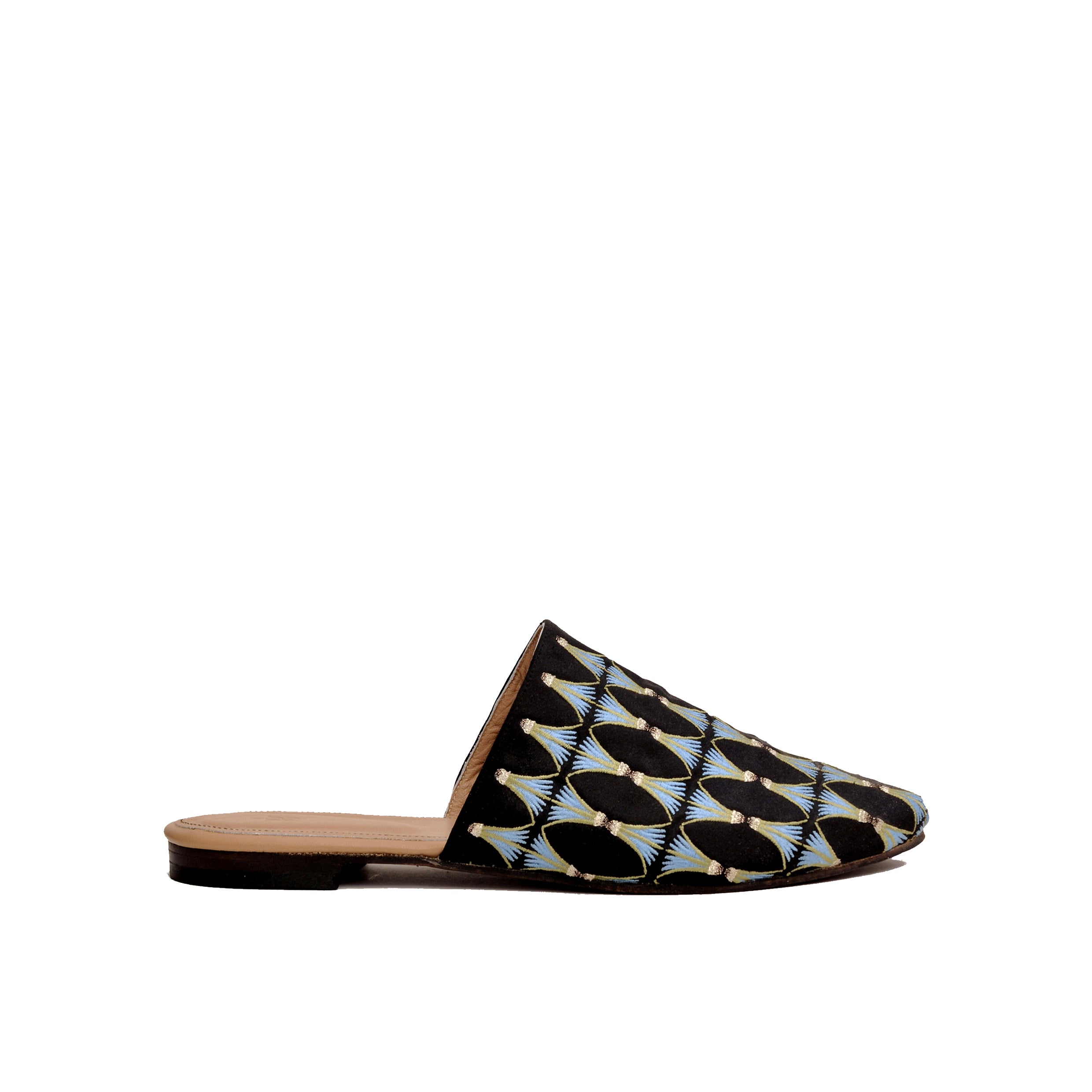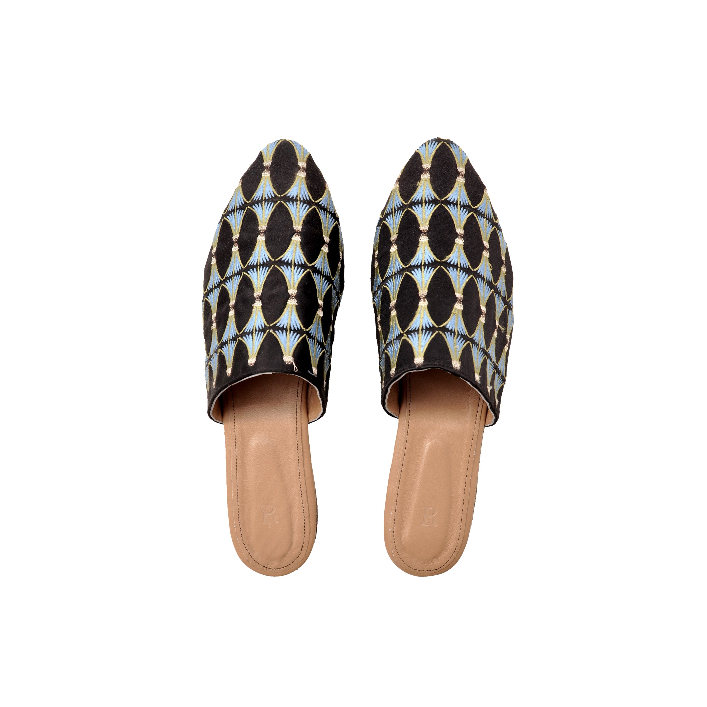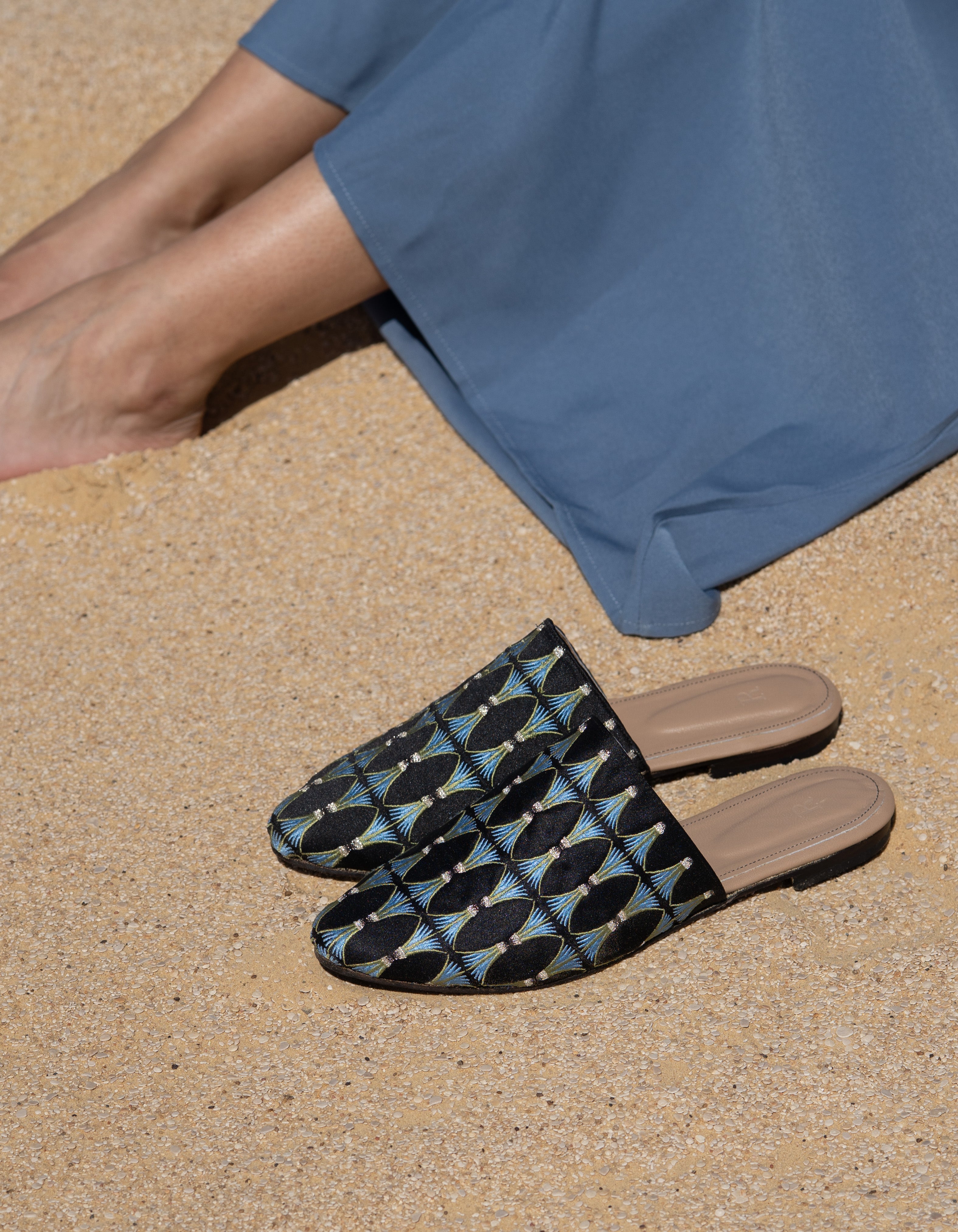 Step into elegance with Loti, a standout piece from RAMLA’s limited-edition collection inspired by Egypt’s pharaonic artistry. This handcrafted mule beautifully showcases a repeating lotus-fan motif — intricately embroidered in soft blue, olive green, and shimmering gold threads — set against a rich black fabric base for a striking contrast.
