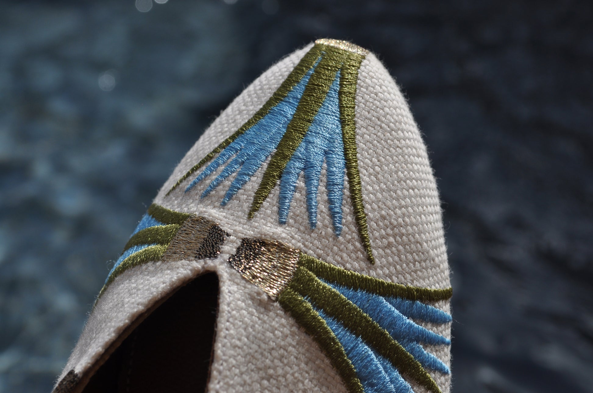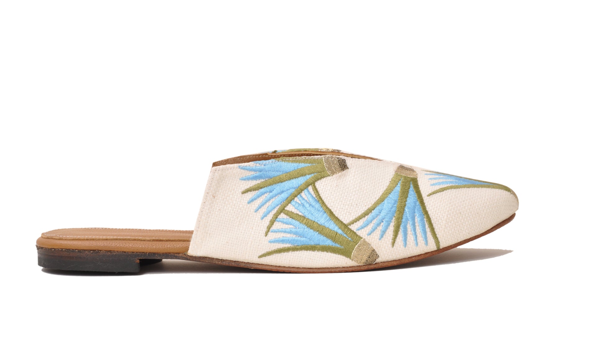 Transform your look with the luxurious RAMLA Lotus Mule. Handcrafted by skilled artisans, these mules feature a natural brown leather sole inside out, with an upper part covered in embroidered linen gold, blue, and green fabric in our classic v cut style. Comfortable for everyday wear, these shoes are perfect for any occasion. Part of our exclusive Ramadan collection, the Lotus Mule Shoes are designed to make a statement and elevate your wardrobe. Experience the beauty of Egyptian craftsmanship and indulge in the ultimate luxury.