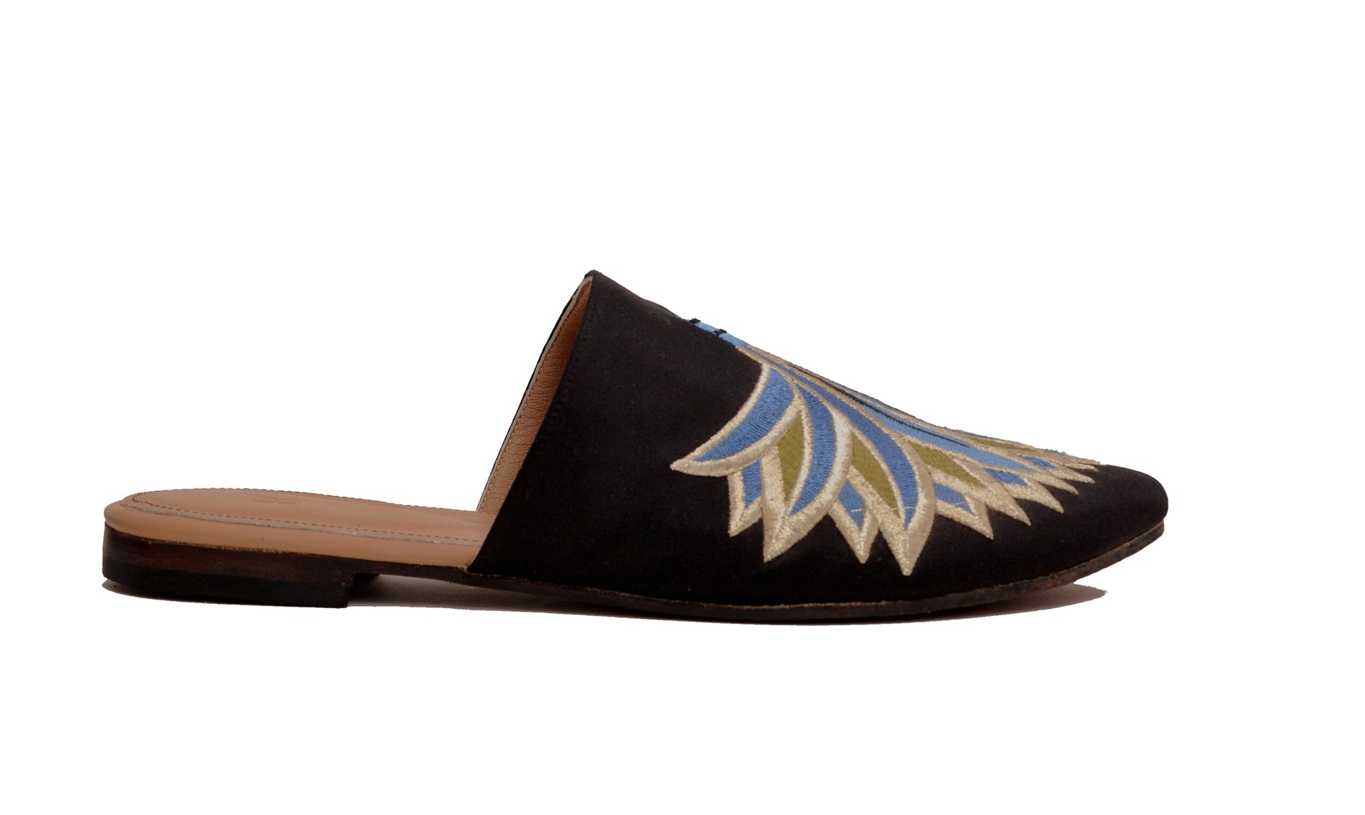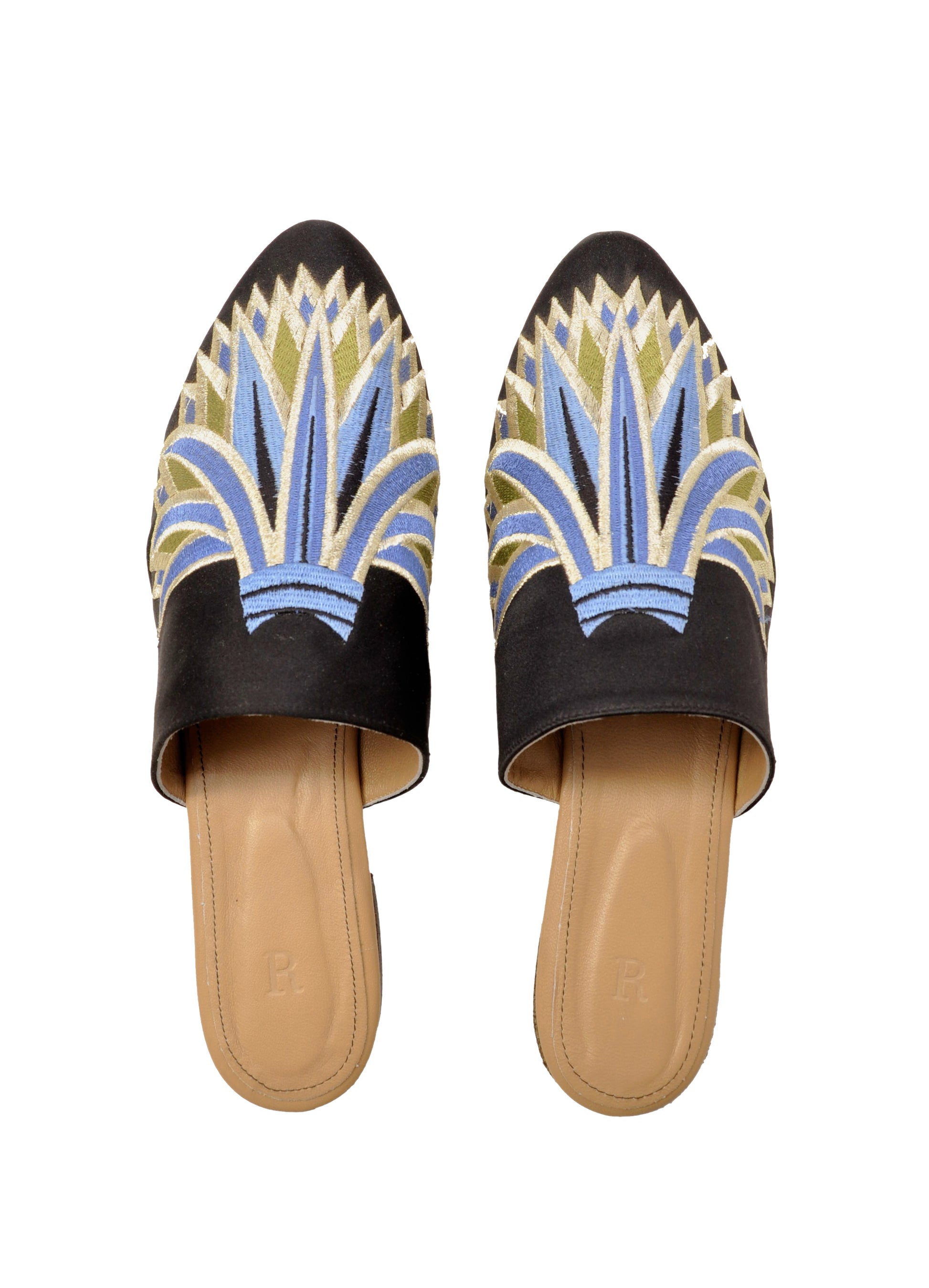 Step into the world of elegance and luxury with RAMLA's limited edition collection. Inspired by Egypts pharaonic heritage. This mule is a beautiful addition to your wardrobe. Handcrafted with care and designed with comfort in mind, the natural brown leather sole and v cut classic style covered with linen gold and different shades of blue embroidered fabric make these shoes perfect for everyday wear. The Flower Field Mule will add a touch of sophistication to your look.