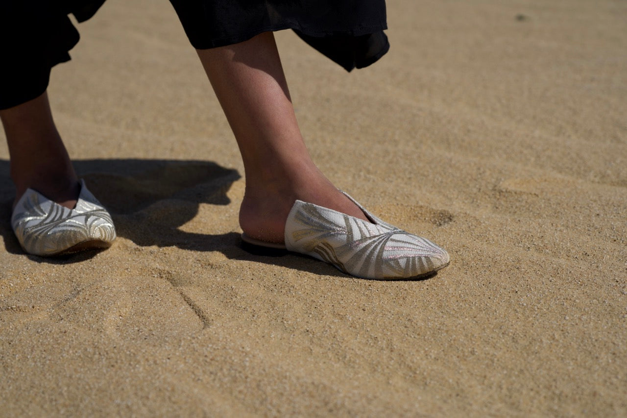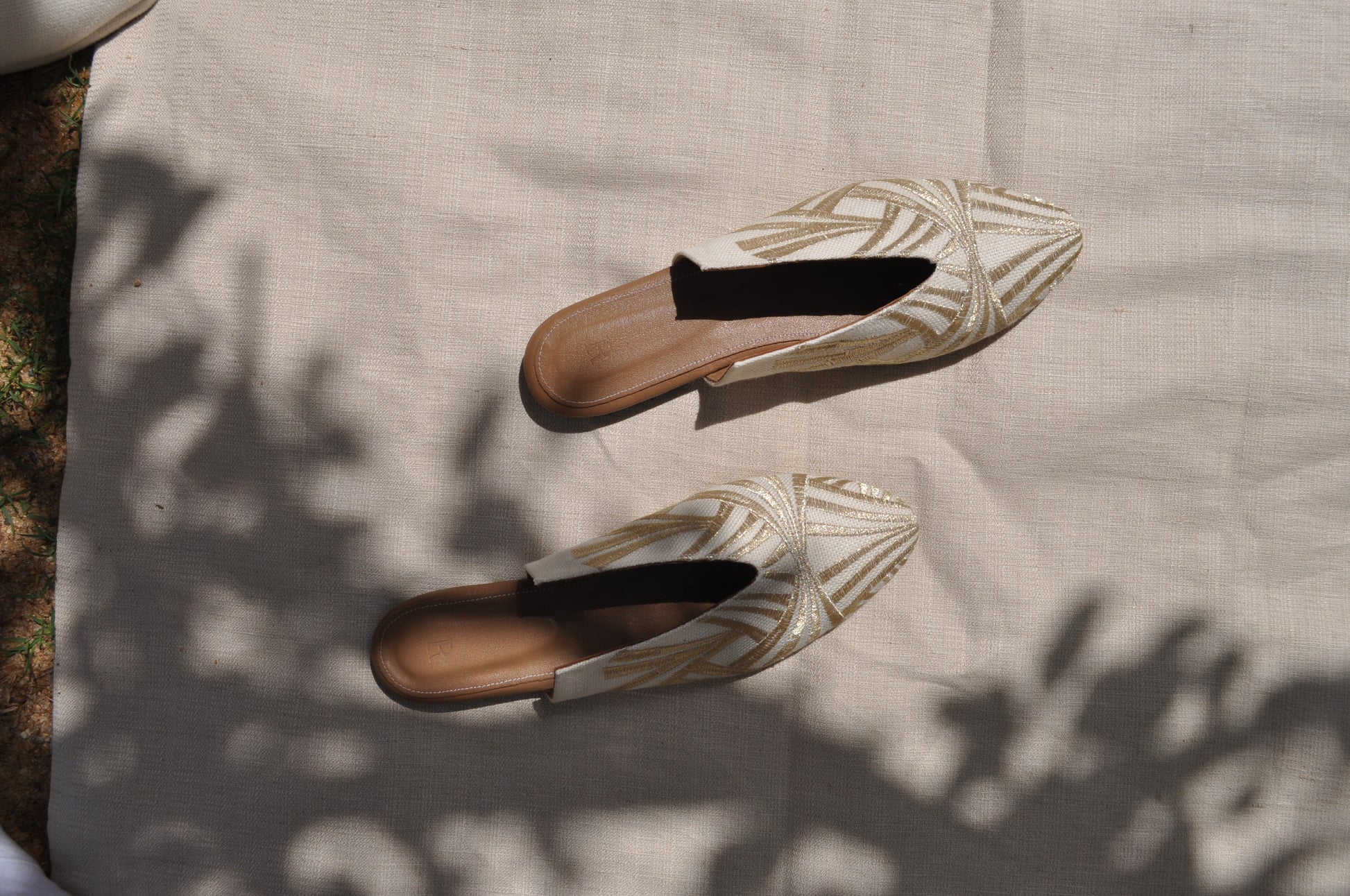 Introducing the ultimate combination of comfort and style: RAMLA's Sahara Mule. Handcrafted with care by Egyptian artisans, these mules feature a natural brown leather sole inside out and linen gold embroidery that exudes elegance and sophistication. Perfect for everyday wear, this classic v cut style is designed to add a touch of luxury to any outfit. These shoes are sure to become a staple in your wardrobe all year long. Elevate your footwear game with the RAMLA Sahara Mule Shoes
