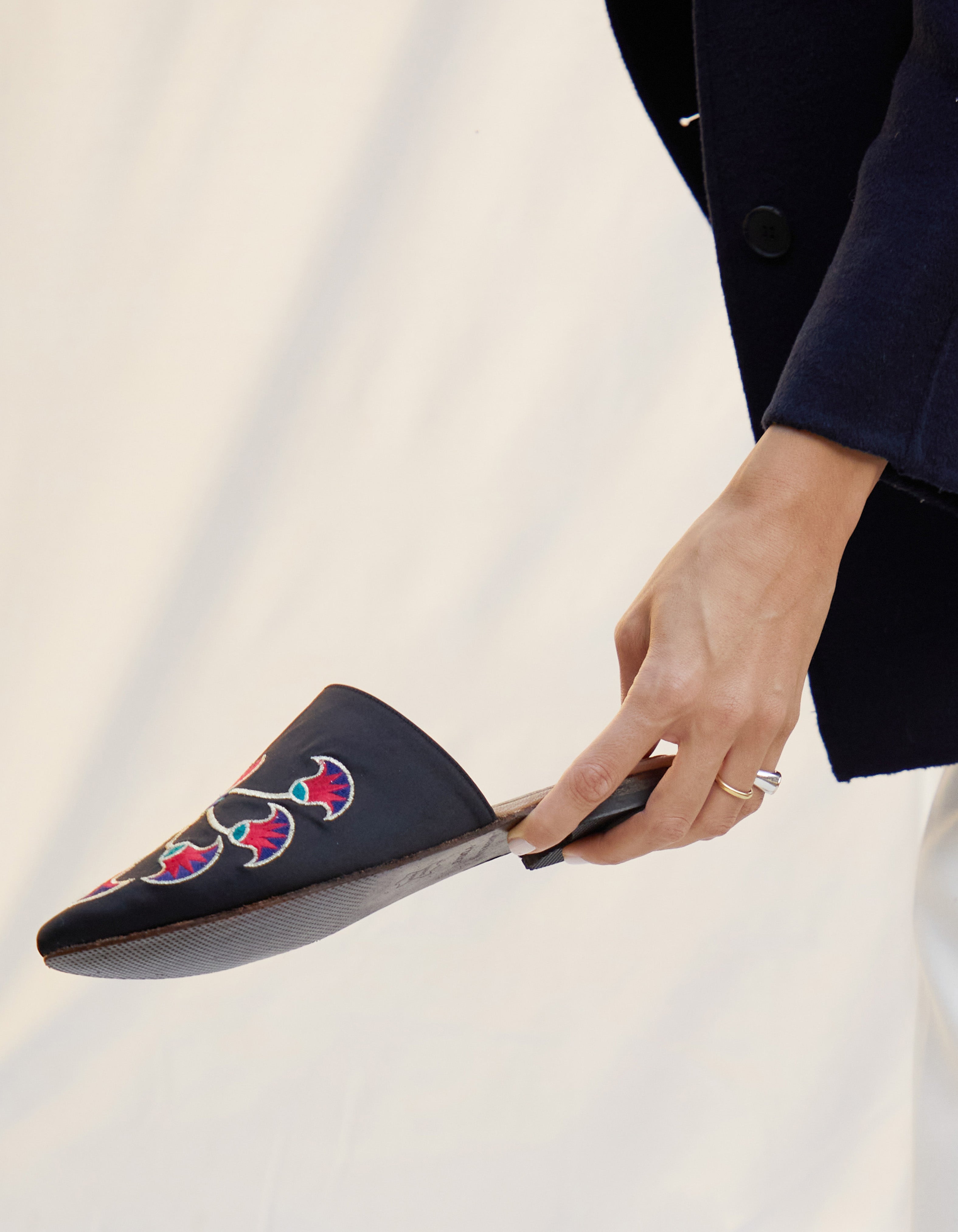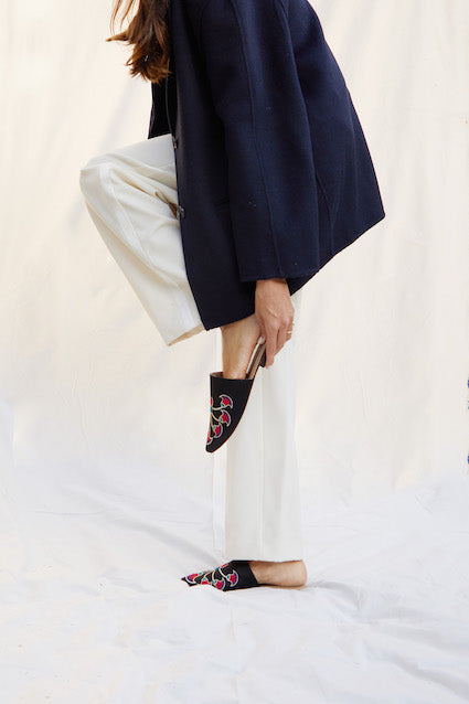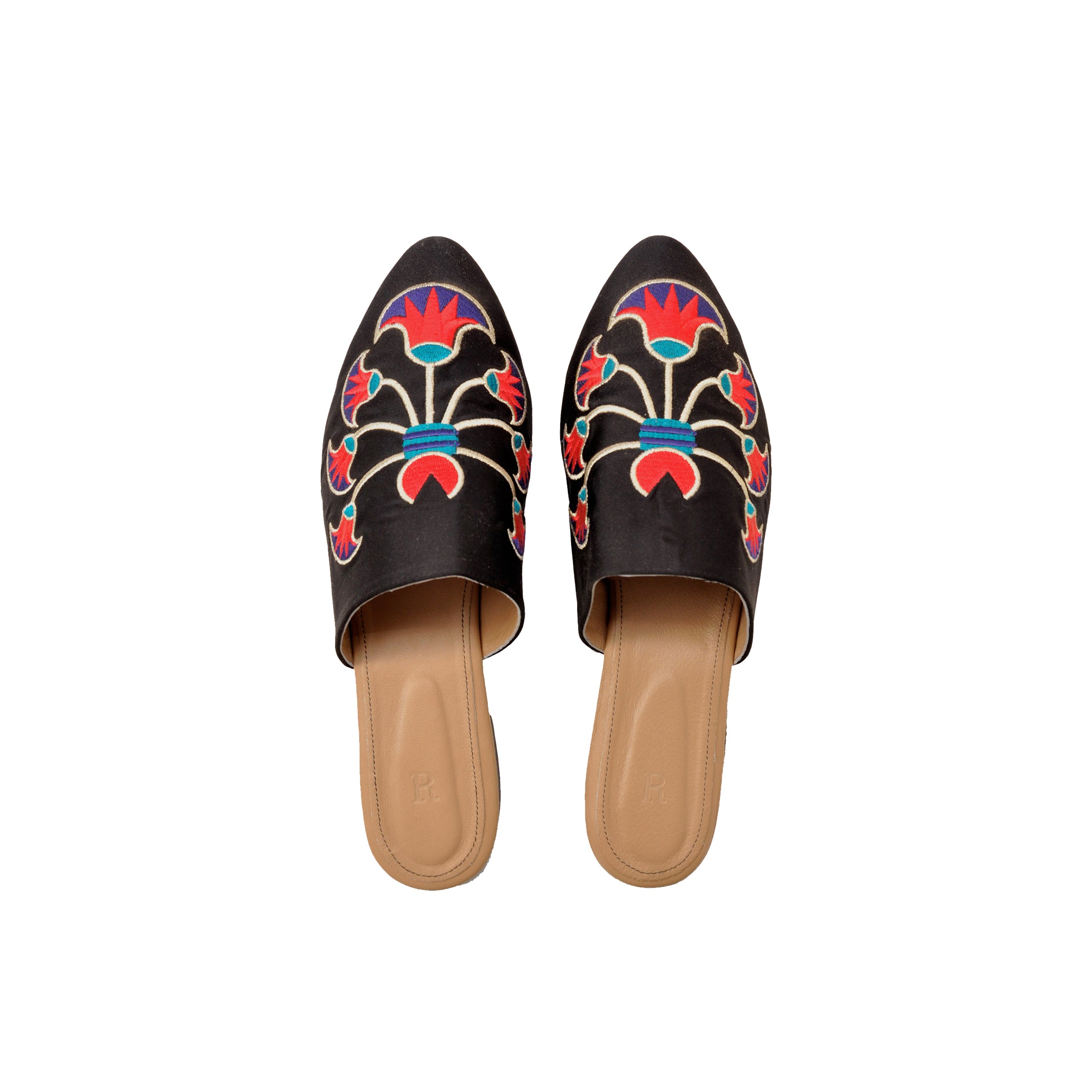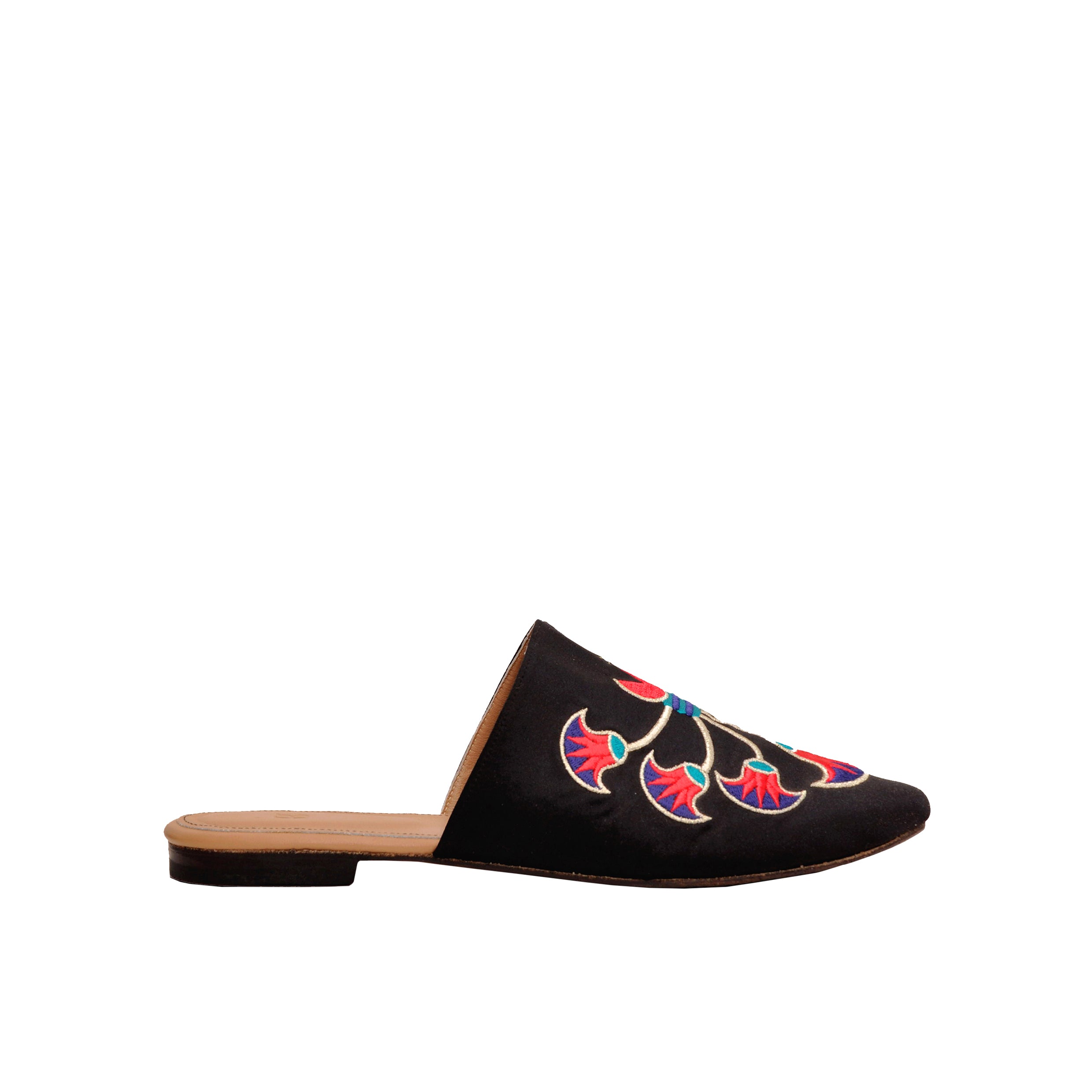 Step into the beauty of pharaonic artistry with Zahra, a striking mule from RAMLA’s limited-edition collection. Handcrafted by Egyptian artisans, this piece features bold lotus-inspired embroidery in vibrant red, turquoise, royal blue, and gold—rich colors deeply rooted in ancient Egyptian symbolism. Set against a smooth black satin base, the design blossoms across the upper, creating a sculptural, eye-catching pattern that feels both heritage-driven and modern.